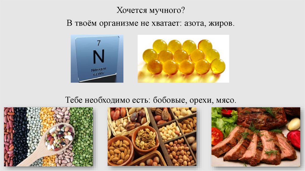 Хочется мучного?В твоём организме не хватает: азота, жиров.