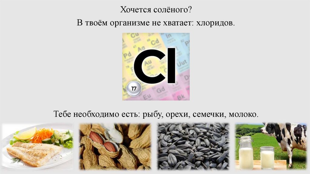 Хочется солёного?В твоём организме не хватает: хлоридов.