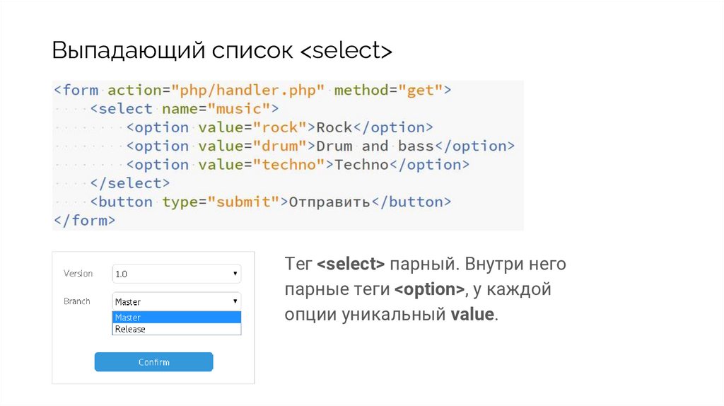 Выпадающий список <select>Тег <select> парный. Внутри него