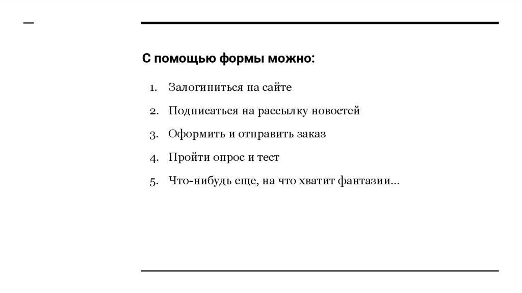 Из чего состоит веб-форма?Формы состоят из полей ввода текста, переключателей,