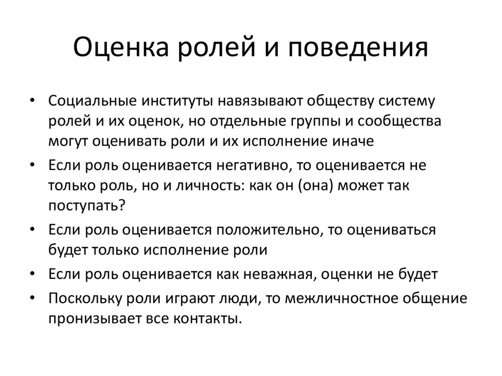 Оценка ролей и поведения• Социальные институты навязывают обществу систему