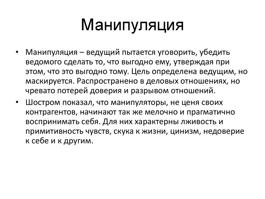 Манипуляция• Манипуляция – ведущий пытается уговорить, убедить