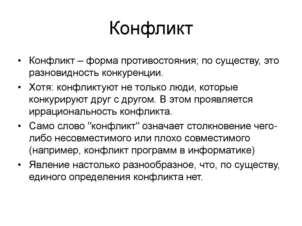 • Само слово "конфликт" означает столкновение чеголибо несовместимого или плохо совместимого