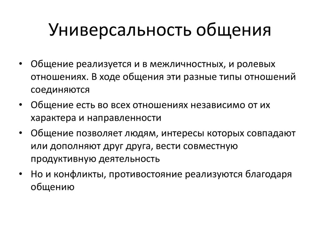 Универсальность общения• Общение реализуется и в межличностных, и ролевых