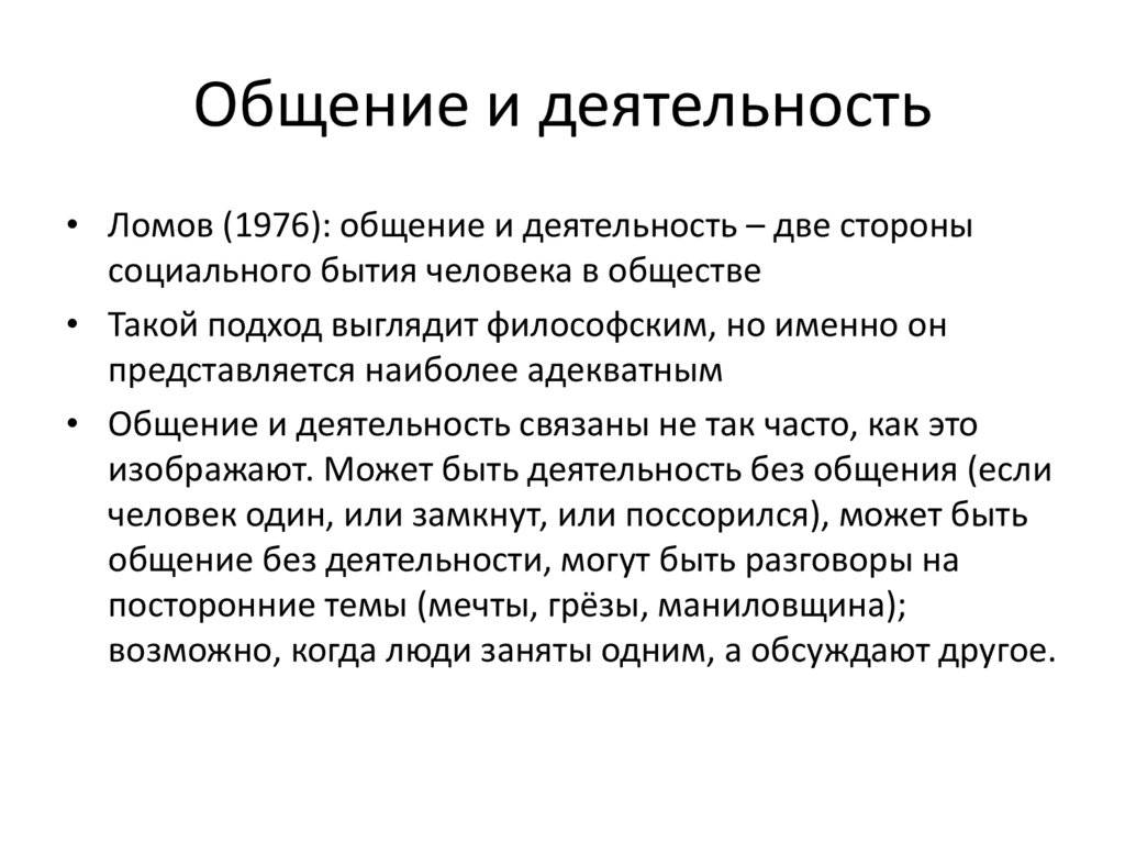 Общение и деятельность• Ломов (1976): общение и деятельность – две стороны