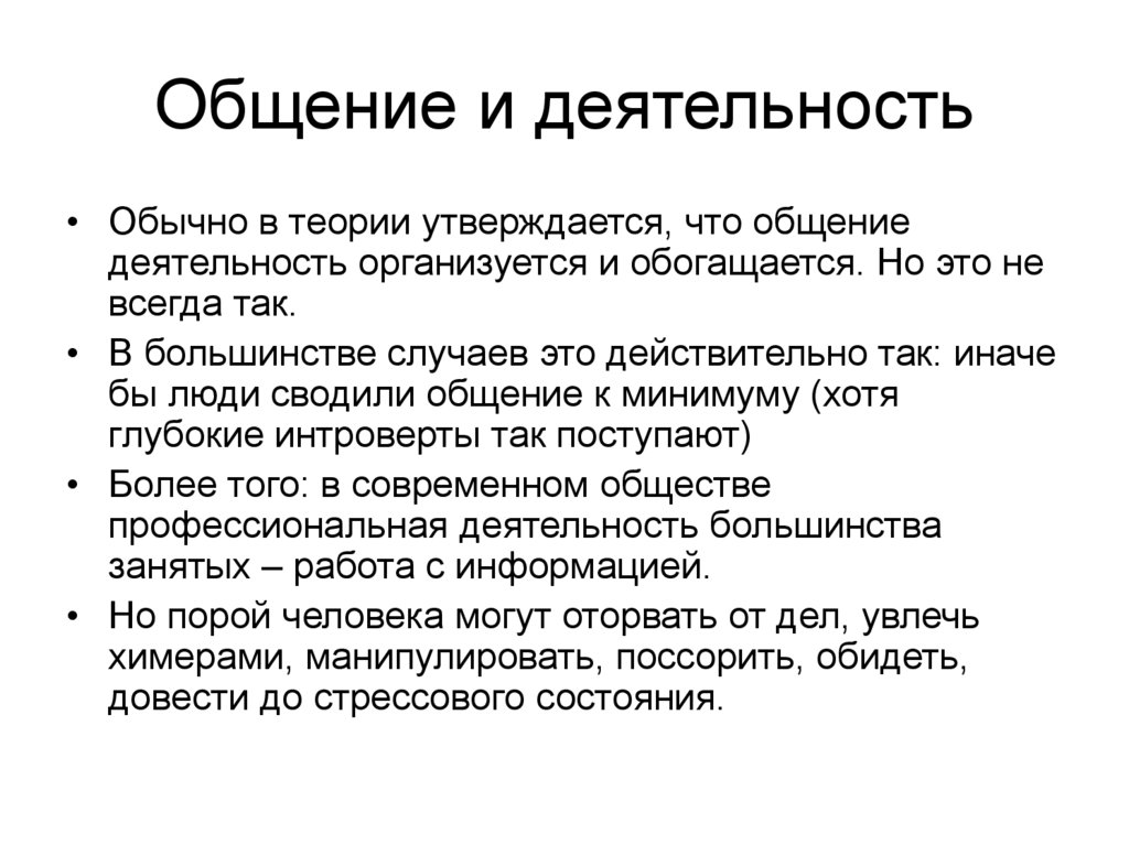 Общение и деятельность• Обычно в теории утверждается, что общение