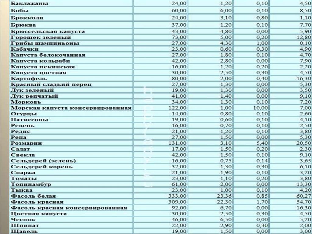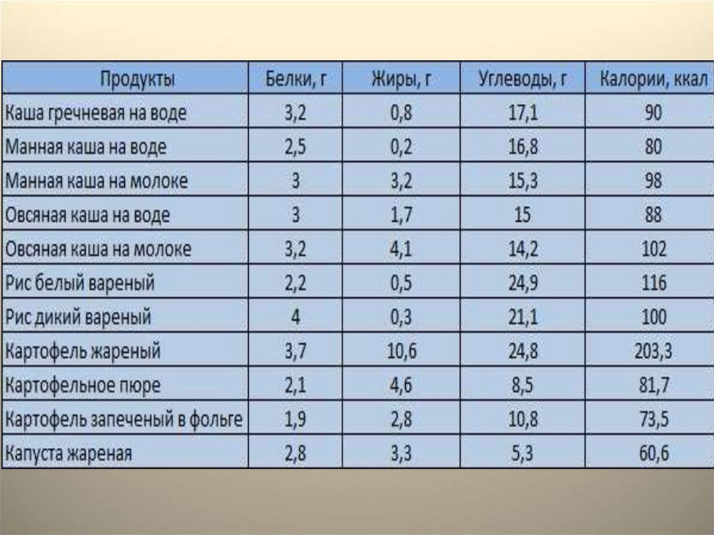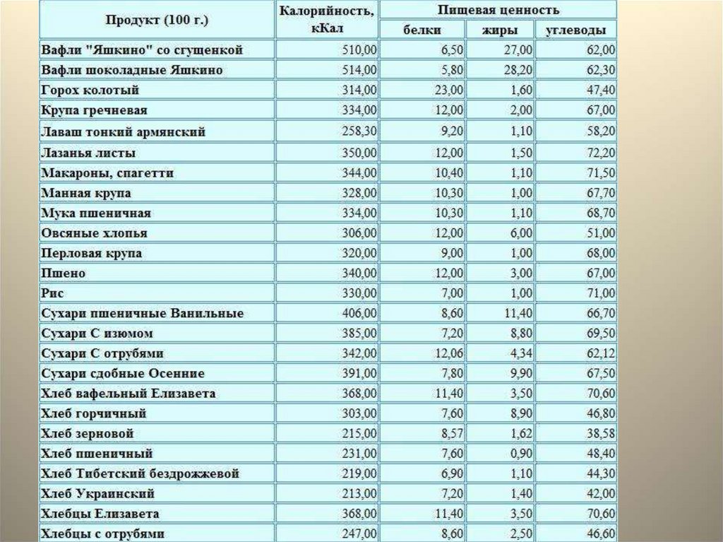 таблицей калорийности