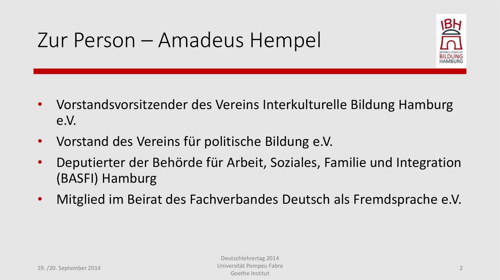 Zur Person – Amadeus Hempel• Vorstandsvorsitzender des Vereins Interkulturelle Bildung Hamburg