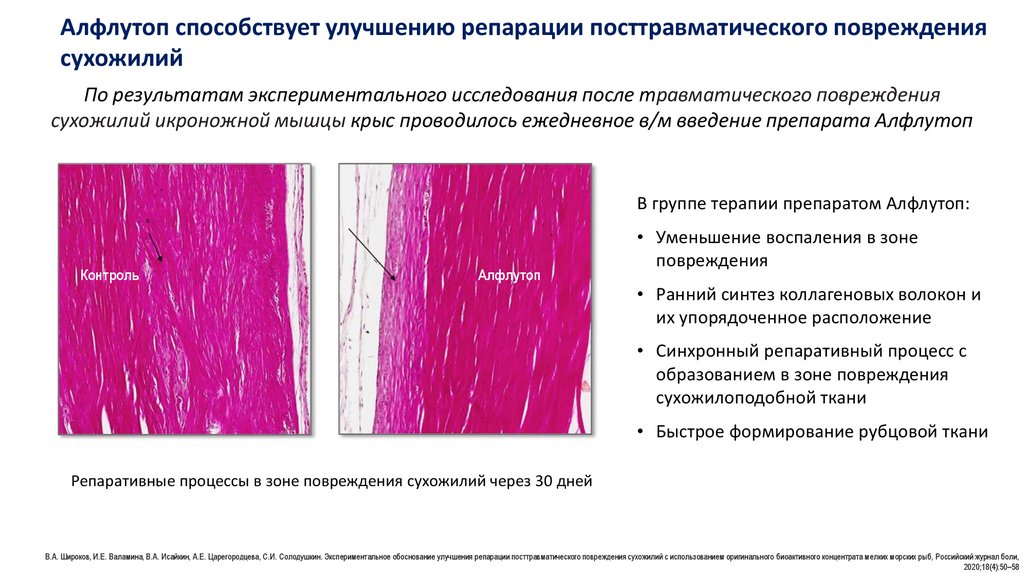 В.А. Широков, И.Е. Валамина, В.А. Исайкин, А.Е. Царегородцева, С.И. Солодушкин. Экспериментальное обоснование улучшения репарации посттравматического повреждения сухожилий с использованием оригинального биоактивного концентрата мелких морских рыб, Российский журнал боли,