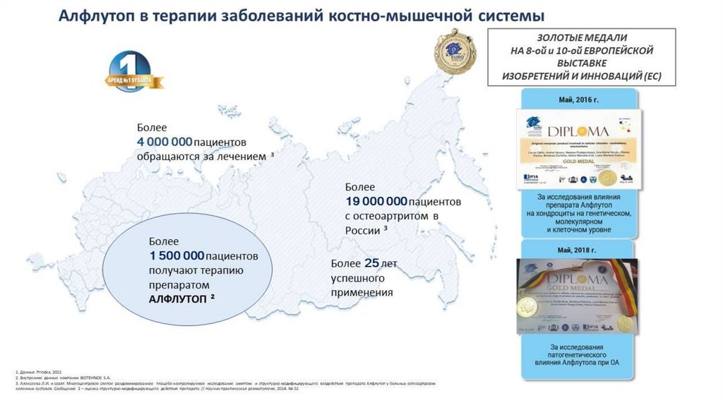 1. Из ИМП ЛП Алфлутоп; 2. L. Olariu, B. Dumitriu, et al. Academy of Romanian Scientists. Annals Series on Biological Sciences, Volume 4, No. 2, 2015-2017, pp. 7-18; 3. О.С. Левин, Д.Ю. Олюнин и соавт. Двойное слепое рандомизированное плацебо-контролируемое