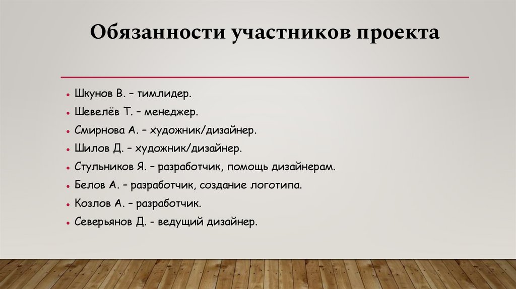 Обязанности участников проекта● Шкунов В. – тимлидер.