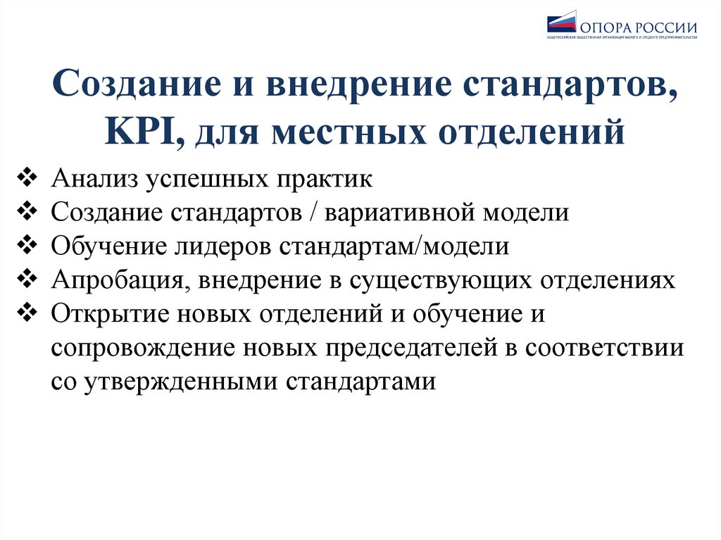 Создание и внедрение стандартов,KPI, для местных отделений