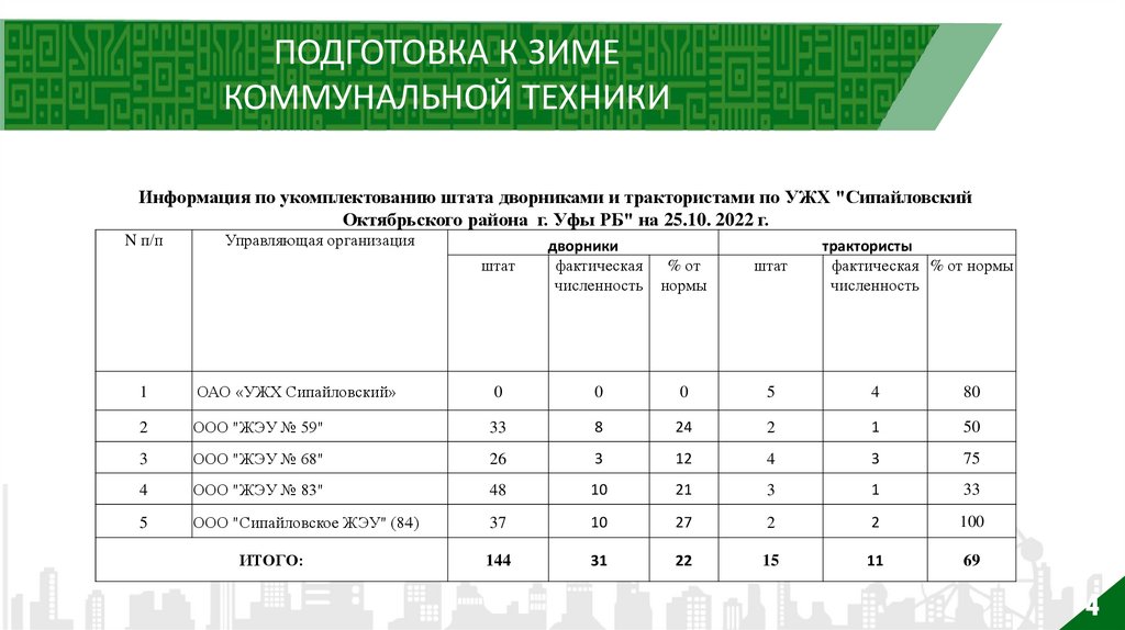 Информация по укомплектованию штата дворниками и трактористами по УЖХ "Сипайловский