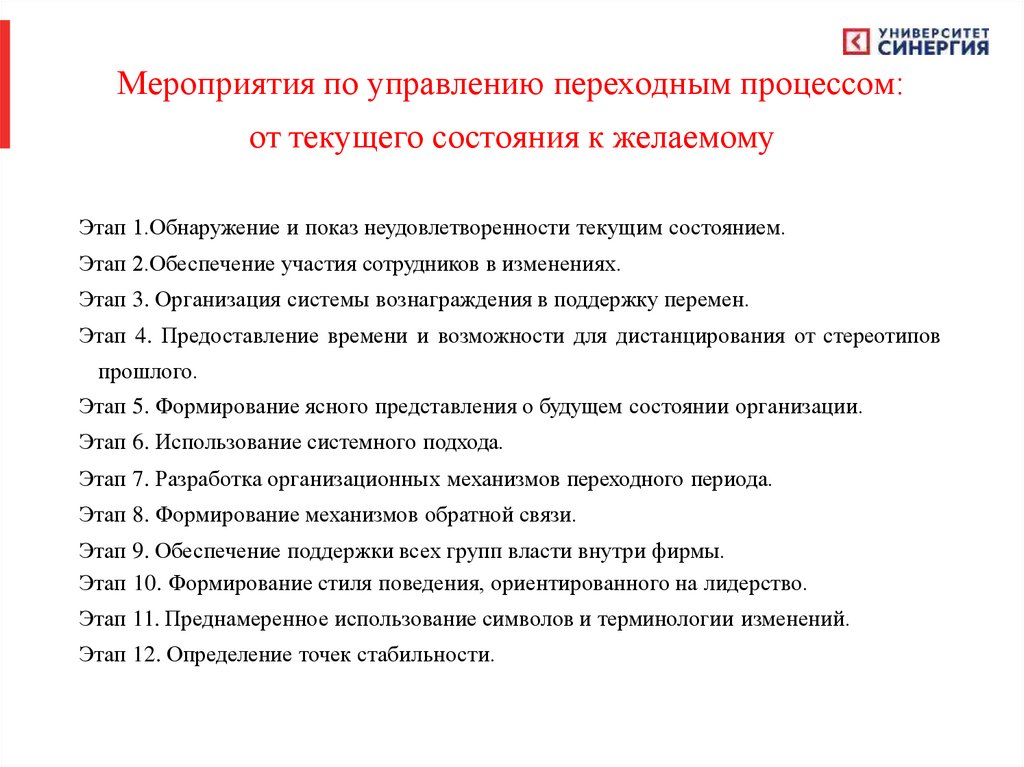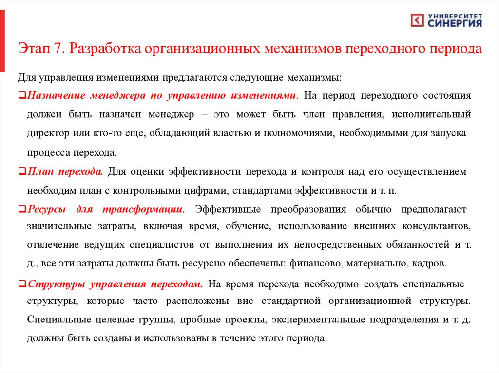 Этап 7. Разработка организационных механизмов переходного периодаДля управления изменениями предлагаются следующие механизмы: