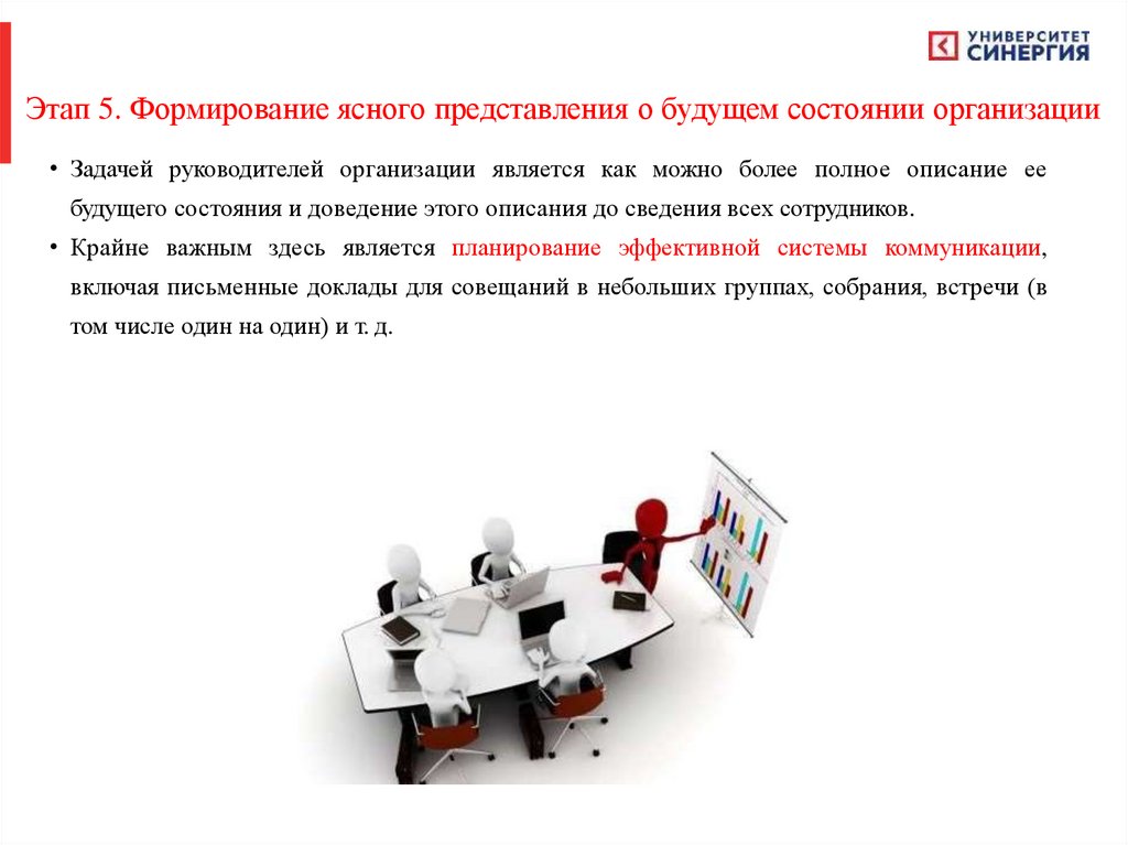 Этап 5. Формирование ясного представления о будущем состоянии организации• Задачей руководителей организации является как можно более полное описание ее