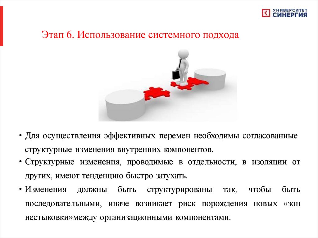 Этап 6. Использование системного подхода• Для осуществления эффективных перемен необходимы согласованные