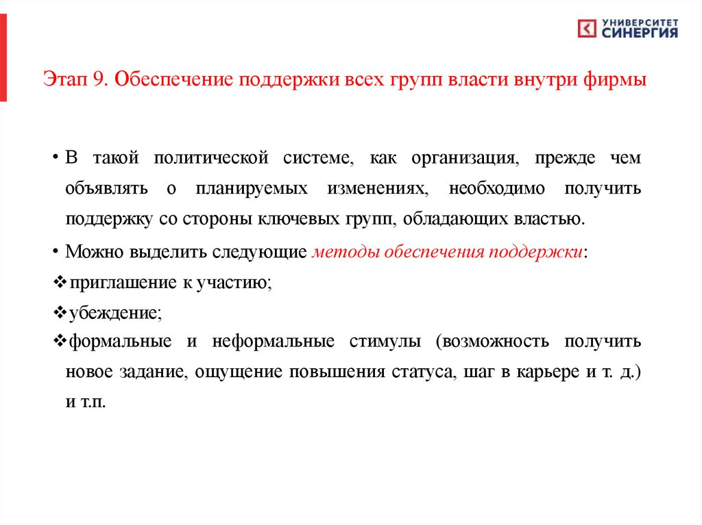 Этап 9. Обеспечение поддержки всех групп власти внутри фирмы• В такой политической системе, как организация, прежде чем