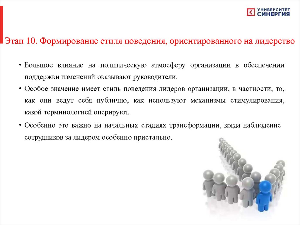 Этап 10. Формирование стиля поведения, ориентированного на лидерство• Большое влияние на политическую атмосферу организации в обеспечении