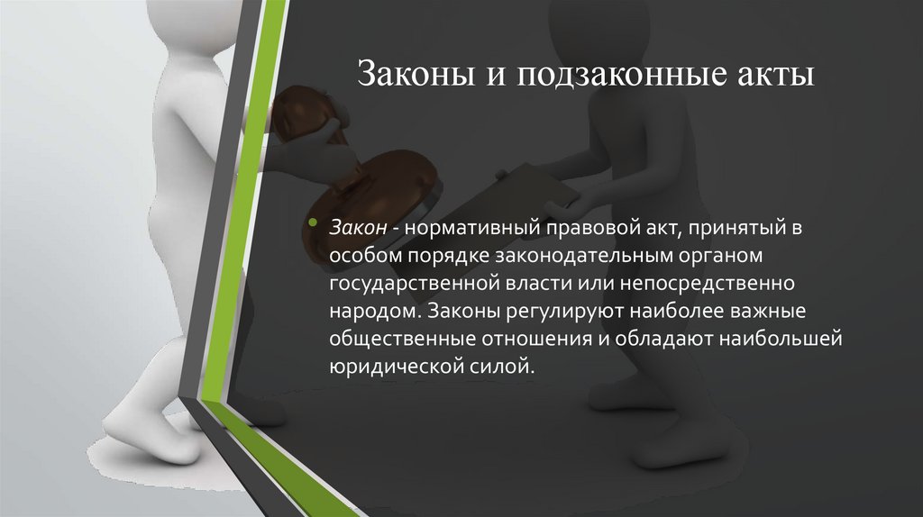 Законы и подзаконные акты• Закон - нормативный правовой акт, принятый в
