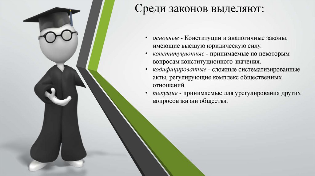Среди законов выделяют:• основные - Конституции и аналогичные законы,