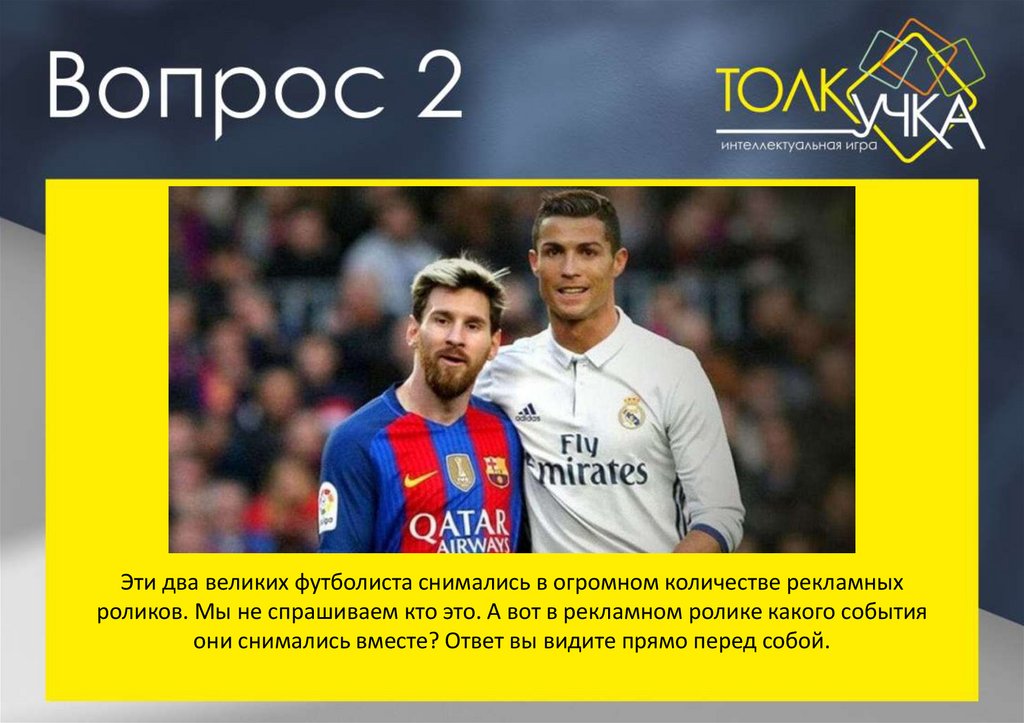 Эти два великих футболиста снимались в огромном количестве рекламныхроликов. Мы не спрашиваем кто это. А вот в рекламном ролике какого события