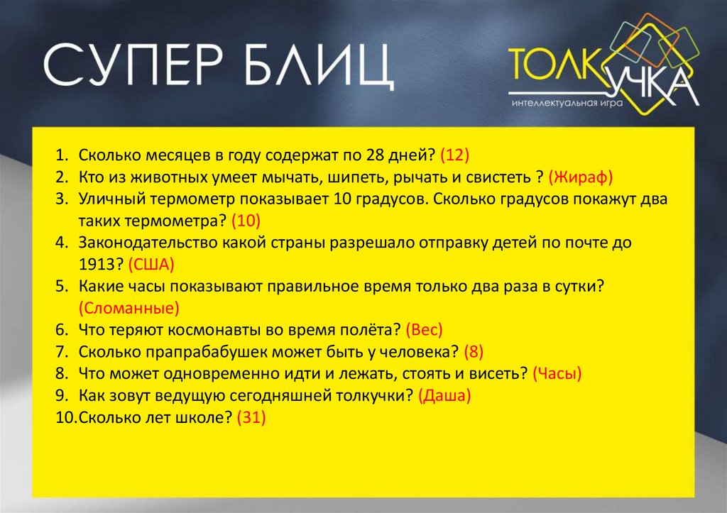 1. Сколько месяцев в году содержат по 28 дней? (12)2. Кто из животных умеет мычать, шипеть, рычать и свистеть ? (Жираф)