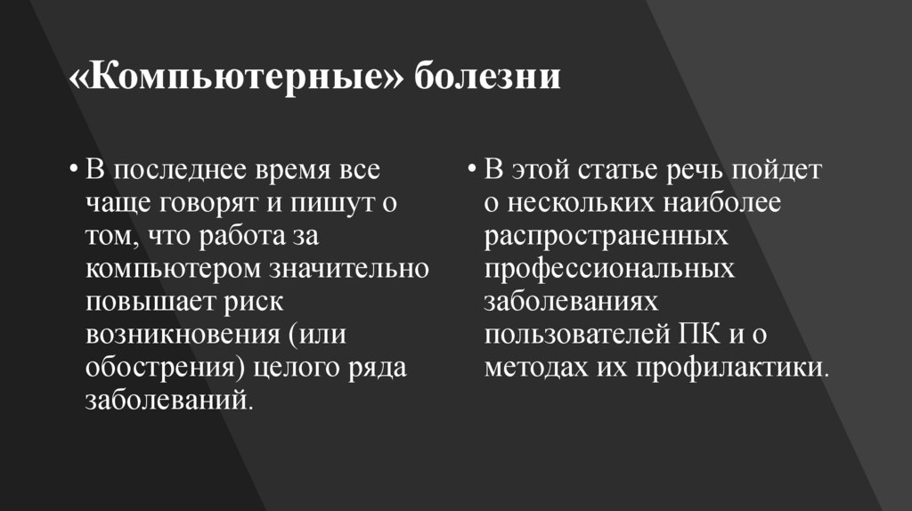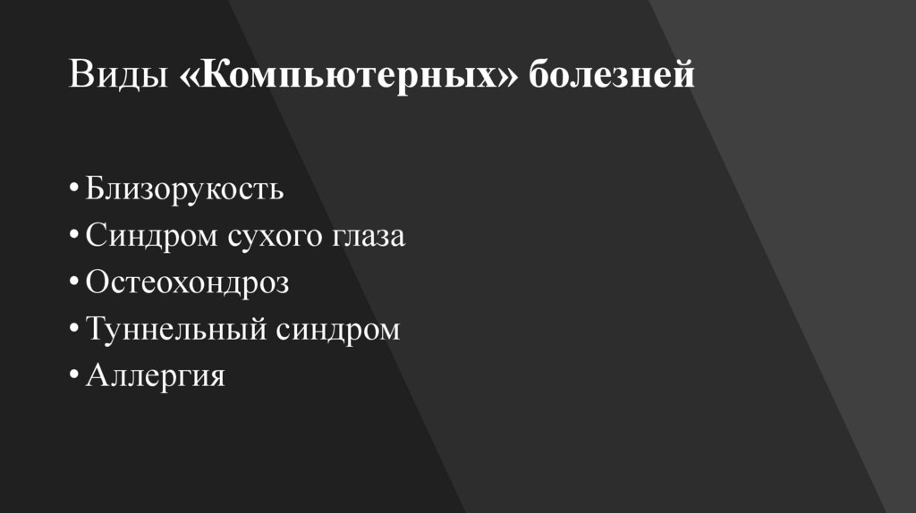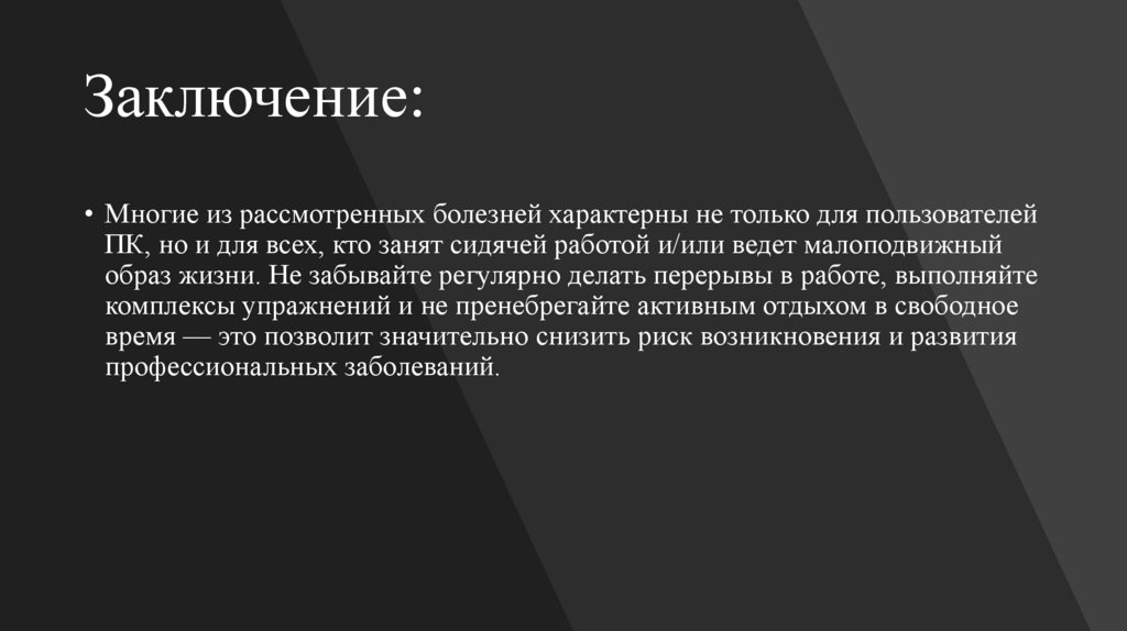 Заключение:• Многие из рассмотренных болезней характерны не только для пользователей