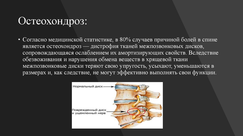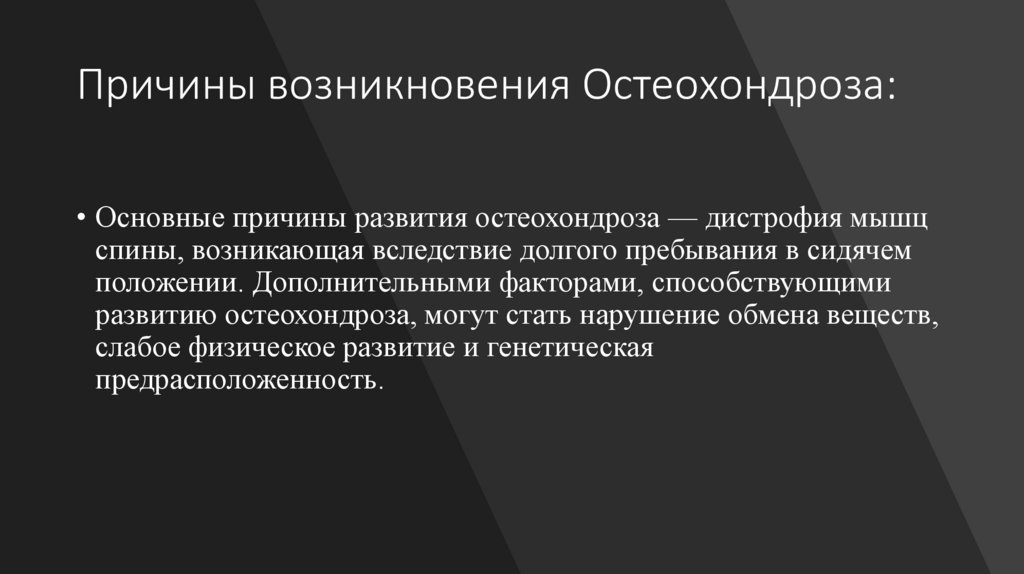 Причины возникновения Остеохондроза:• Основные причины развития остеохондроза — дистрофия мышц