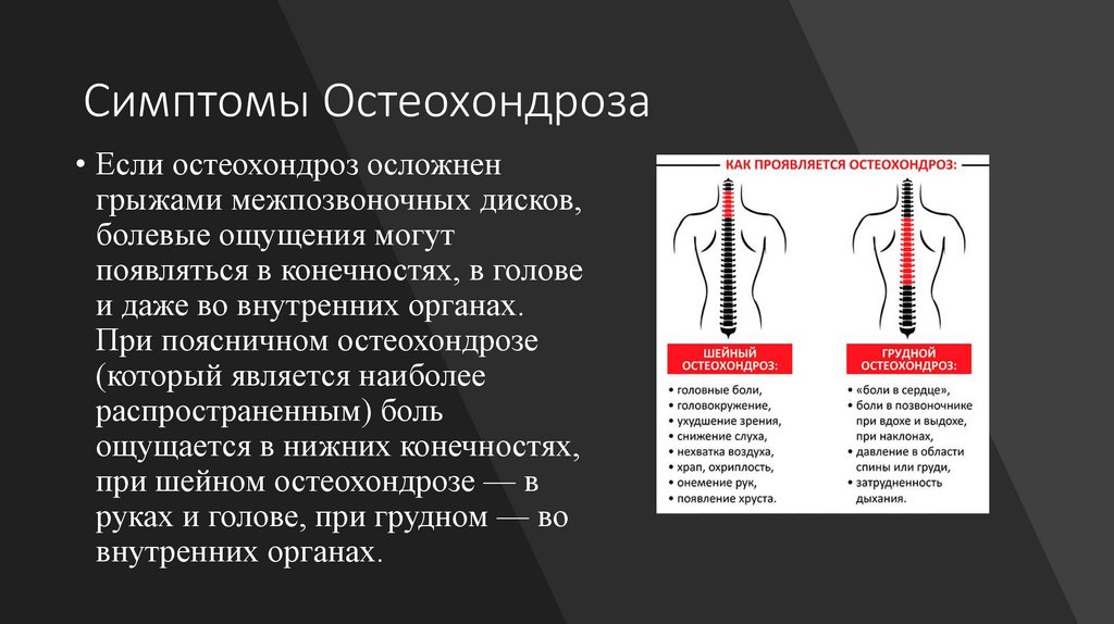 Симптомы Остеохондроза• Если остеохондроз осложнен