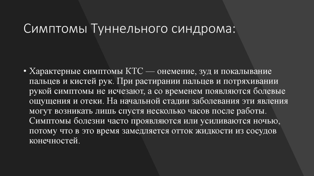 Симптомы Туннельного синдрома:• Характерные симптомы КТС — онемение, зуд и покалывание