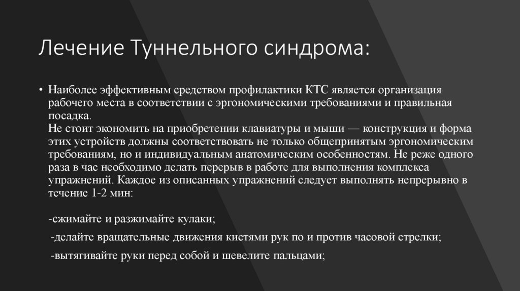Лечение Туннельного синдрома:• Наиболее эффективным средством профилактики КТС является организация