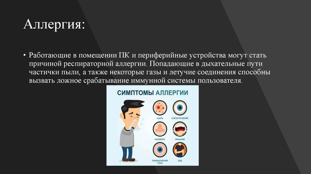 Аллергия:• Работающие в помещении ПК и периферийные устройства могут стать