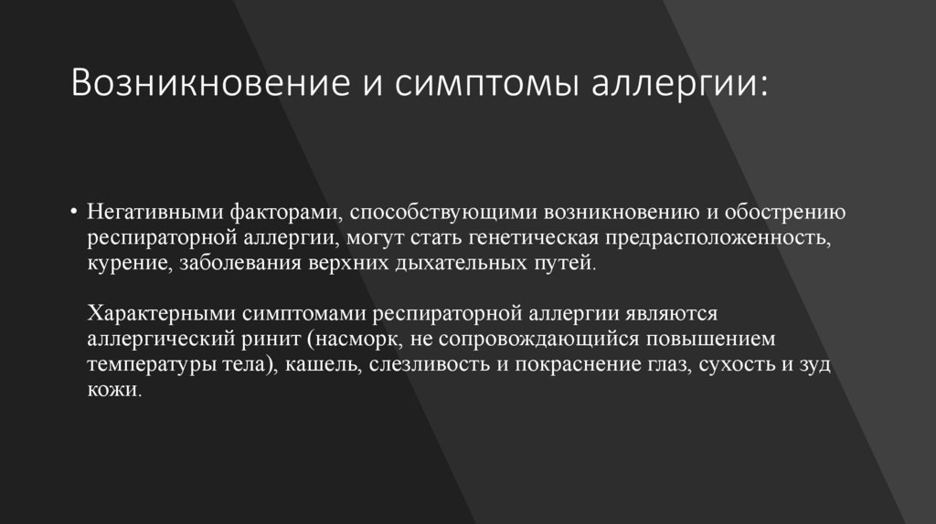 Возникновение и симптомы аллергии:• Негативными факторами, способствующими возникновению и обострению