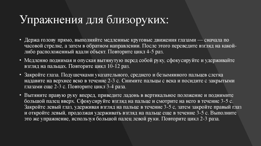 Упражнения для близоруких:• Держа голову прямо, выполняйте медленные круговые движения глазами — сначала по