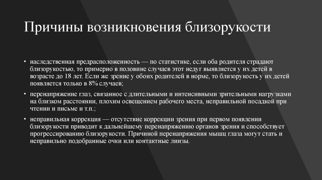 Причины возникновения близорукости• наследственная предрасположенность — по статистике, если оба родителя страдают