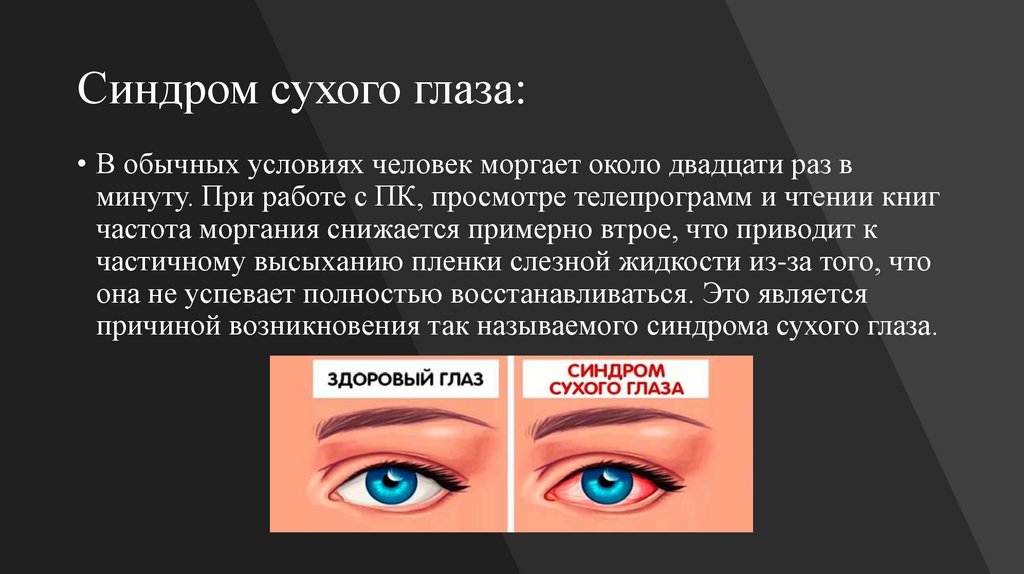 Синдром сухого глаза:• В обычных условиях человек моргает около двадцати раз в