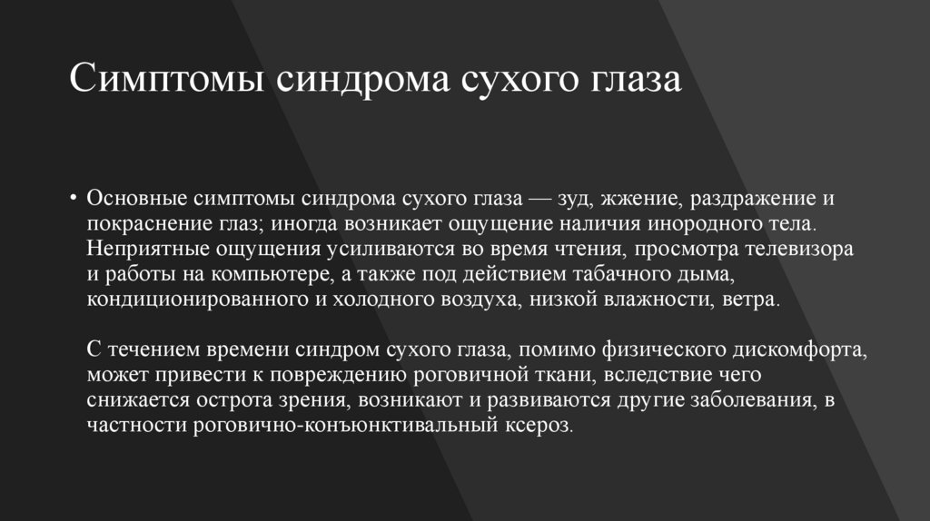 Симптомы синдрома сухого глаза• Основные симптомы синдрома сухого глаза — зуд, жжение, раздражение и