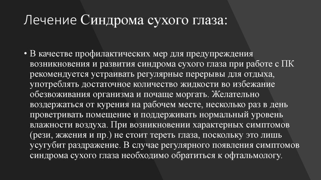 Лечение Синдрома сухого глаза:• В качестве профилактических мер для предупреждения