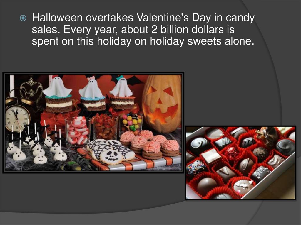 Halloween overtakes Valentine's Day in candysales. Every year, about 2 billion dollars is