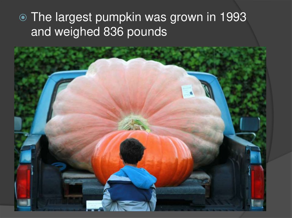 The largest pumpkin was grown in 1993and weighed 836 pounds