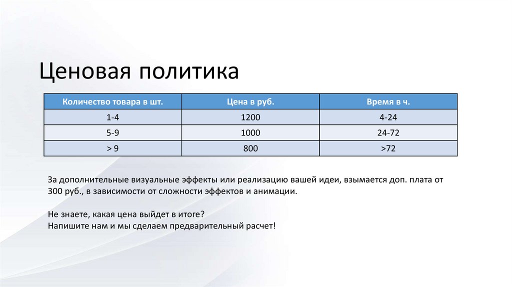 За дополнительные визуальные эффекты или реализацию вашей идеи, взымается доп. плата от