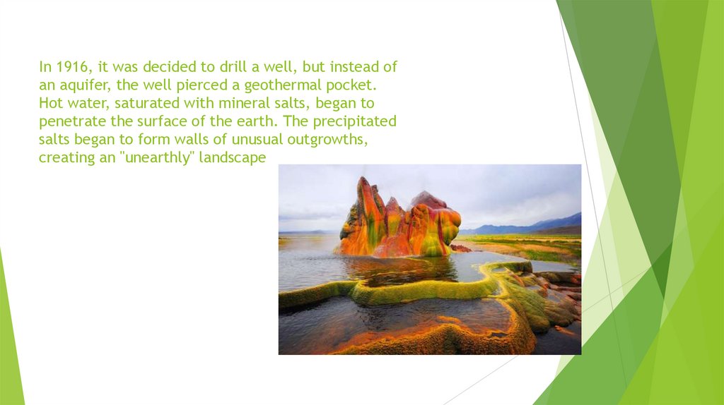 In 1916, it was decided to drill a well, but instead ofan aquifer, the well pierced a geothermal pocket.