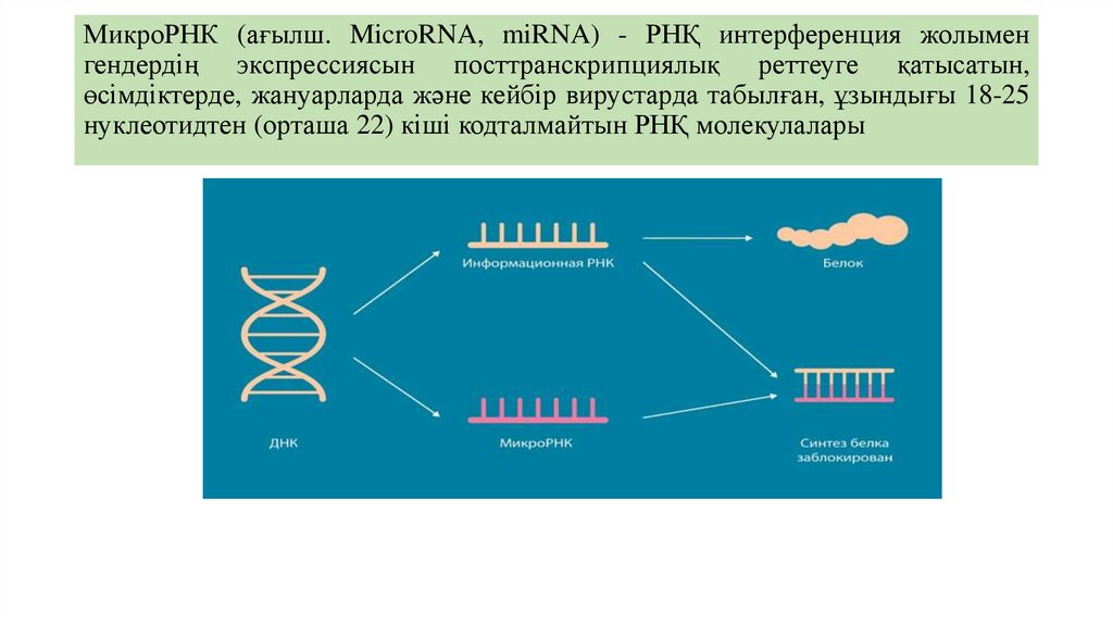 МикроРНК (ағылш. MicroRNA, miRNA) - РНҚ интерференция жолыменгендердің экспрессиясын посттранскрипциялық реттеуге қатысатын,