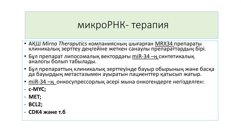 микроРНК- терапия• АҚШ Mirna Theraputics компаниясның шығарған МRX34 препараты