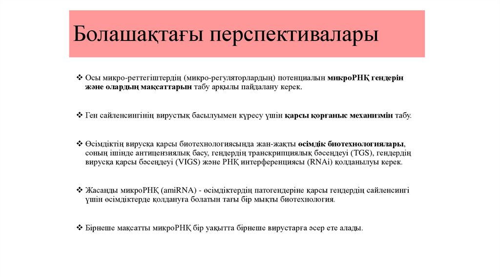 Болашақтағы перспективаларыОсы микро-реттегіштердің (микро-регуляторлардың) потенциалын микроРНҚ гендерін