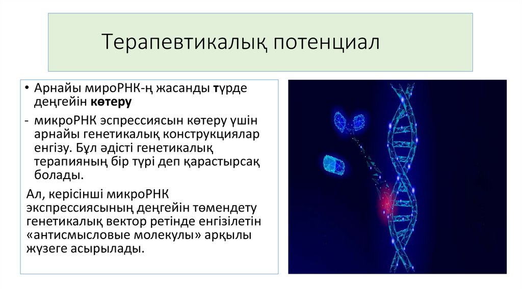 Терапевтикалық потенциал• Арнайы мироРНК-ң жасанды түрде