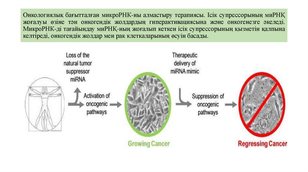 Онкологиялық бағытталған микроРНК-ны алмастыру терапиясы. Ісік супрессорының миРНҚжоғалуы өзіне тән онкогендік жолдардың гиперактивациясына және онкогенезге әкеледі.