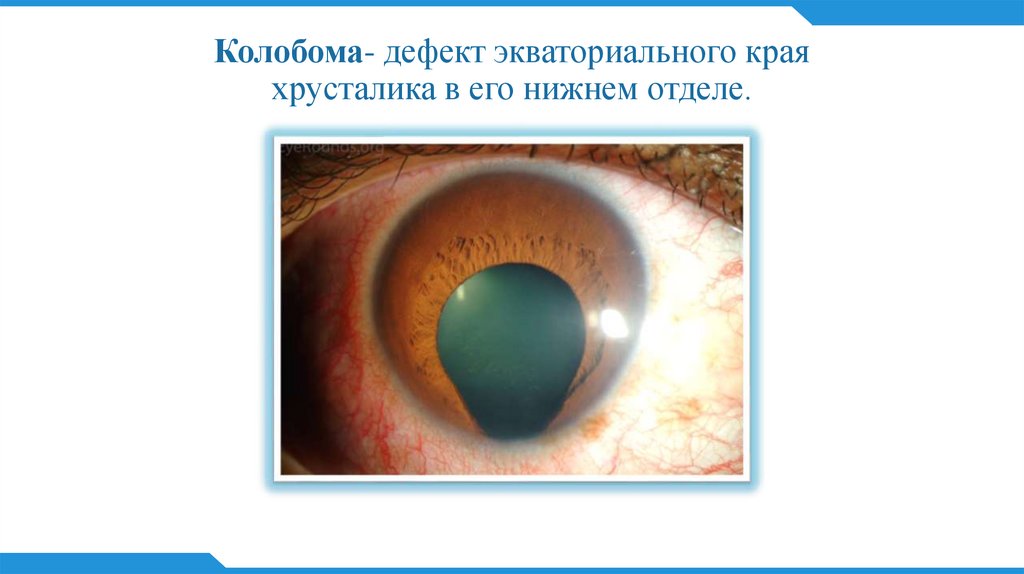 Колобома- дефект экваториального краяхрусталика в его нижнем отделе.