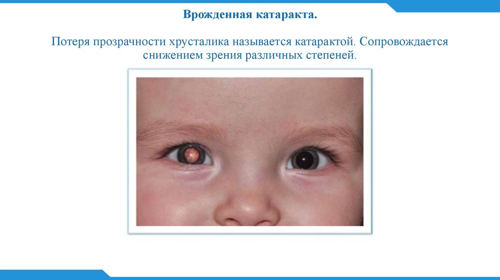 Врожденная катаракта.Потеря прозрачности хрусталика называется катарактой. Сопровождается