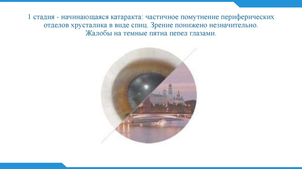 1 стадия - начинающаяся катаракта: частичное помутнение периферическихотделов хрусталика в виде спиц. Зрение понижено незначительно.